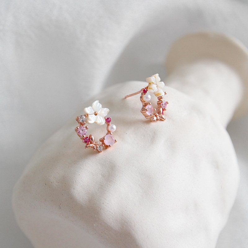 Pink CZ Shell Flowers Garland 925 Sterling Silver Stud Earrings